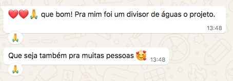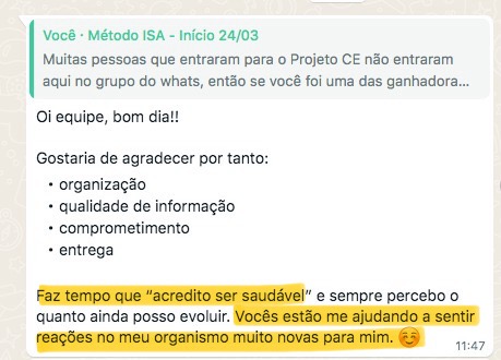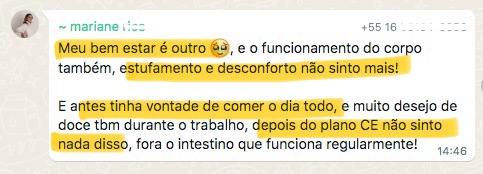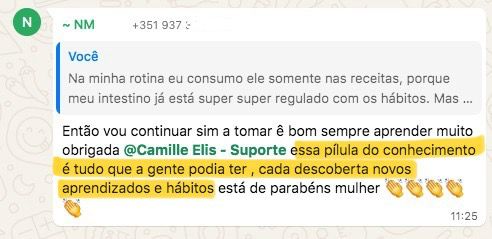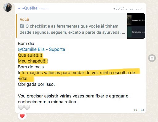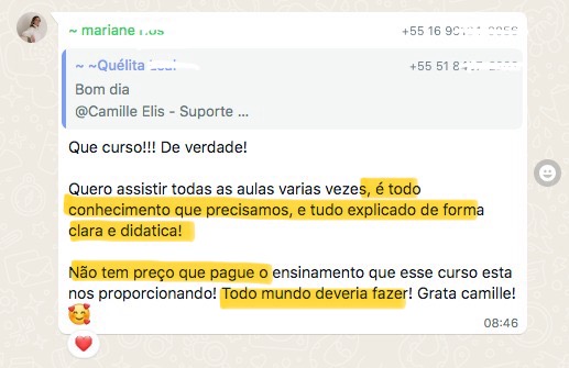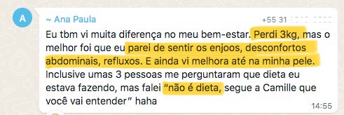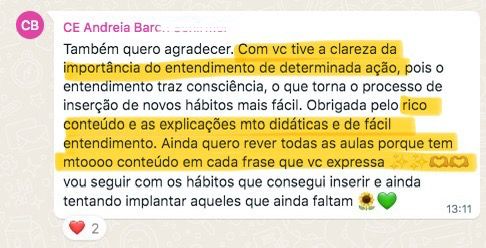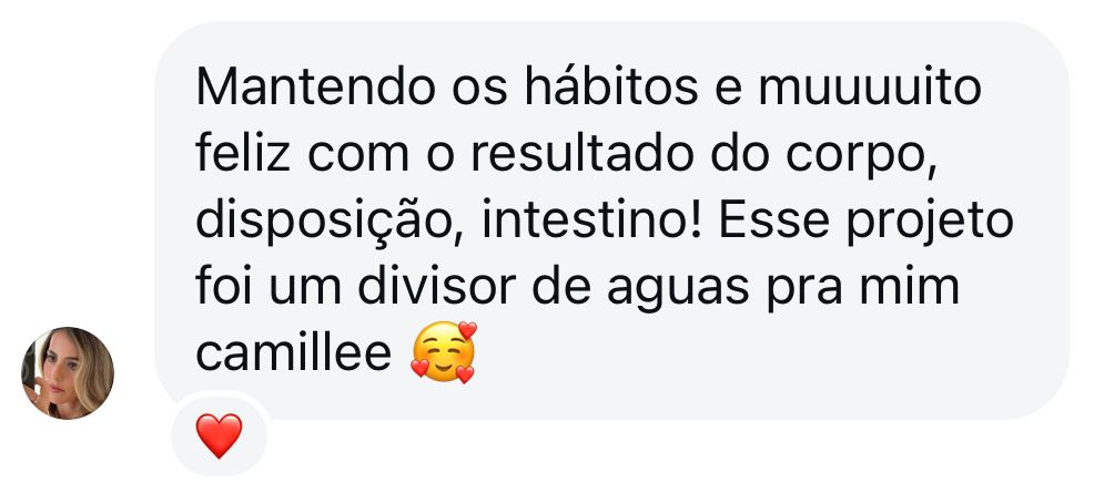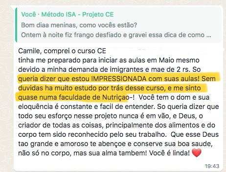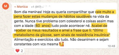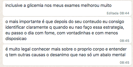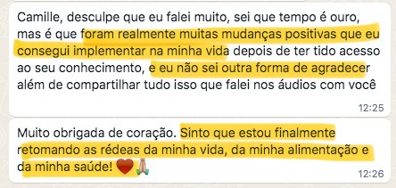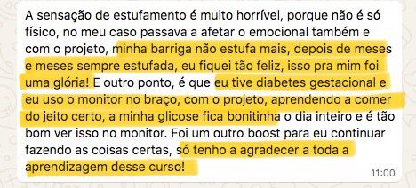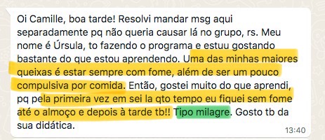 “Quando eu entrei no curso eu tava vindo de um programa de emagrecimento e de uma alimentação bem ruim. Quando terminou o programa eu falei e agora, pra onde eu vou? E ai eu lembrei de você e era bem o que eu queria entender. Eu fiquei bem feliz porque isso me deu o que eu preciso para ter autonomia, que era o que eu queria”